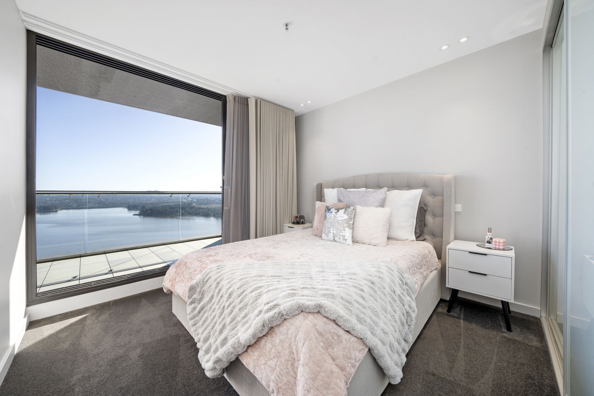 Designed to maximise natural light and space, the open-plan living and dining area flows seamlessly through full-height stacker doors onto a private balcony, creating the perfect indoor-outdoor setting for both relaxation and entertaining. Floor-to-ceiling windows wrap around the living spaces, capturing uninterrupted water views and enhancing the sense of openness.