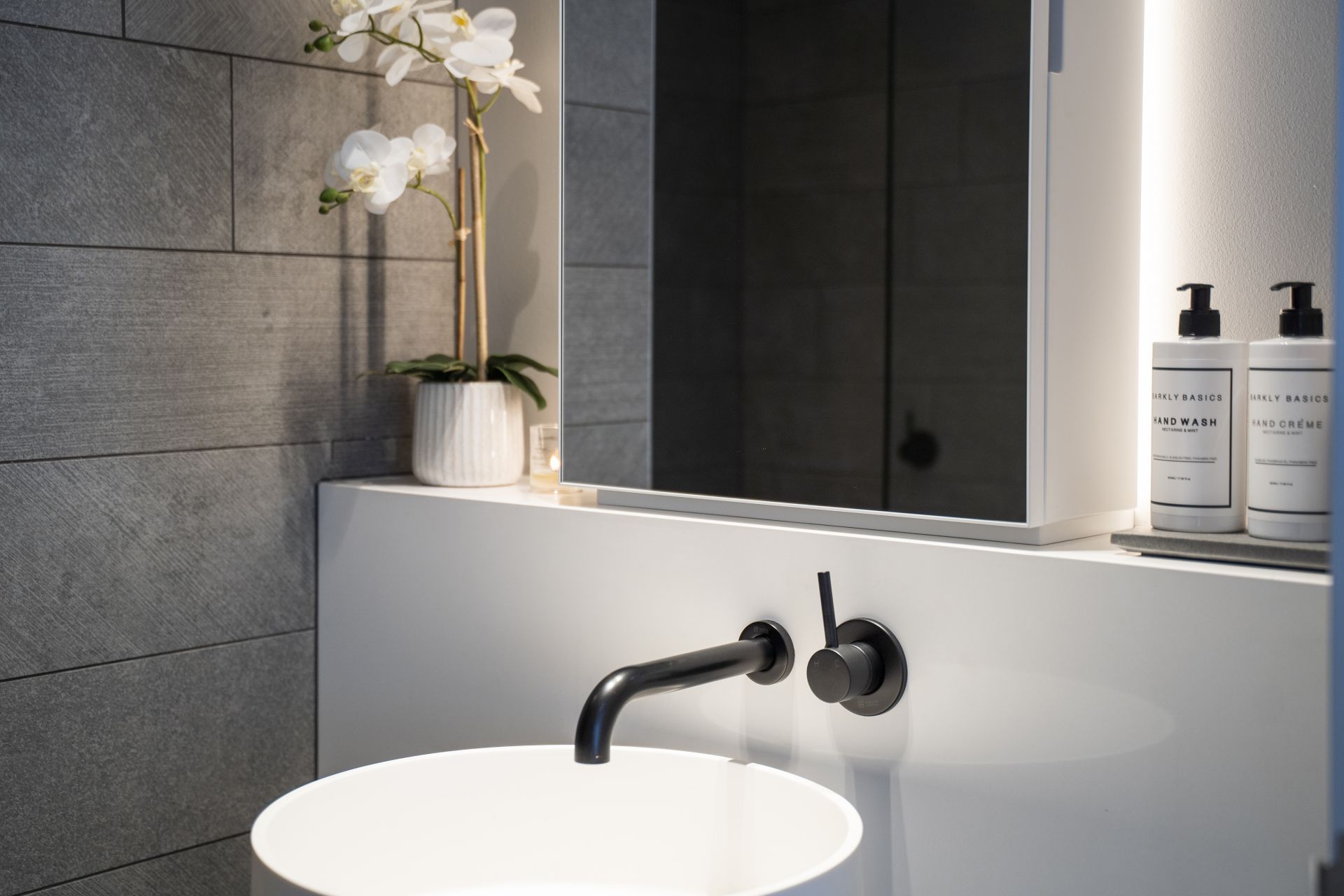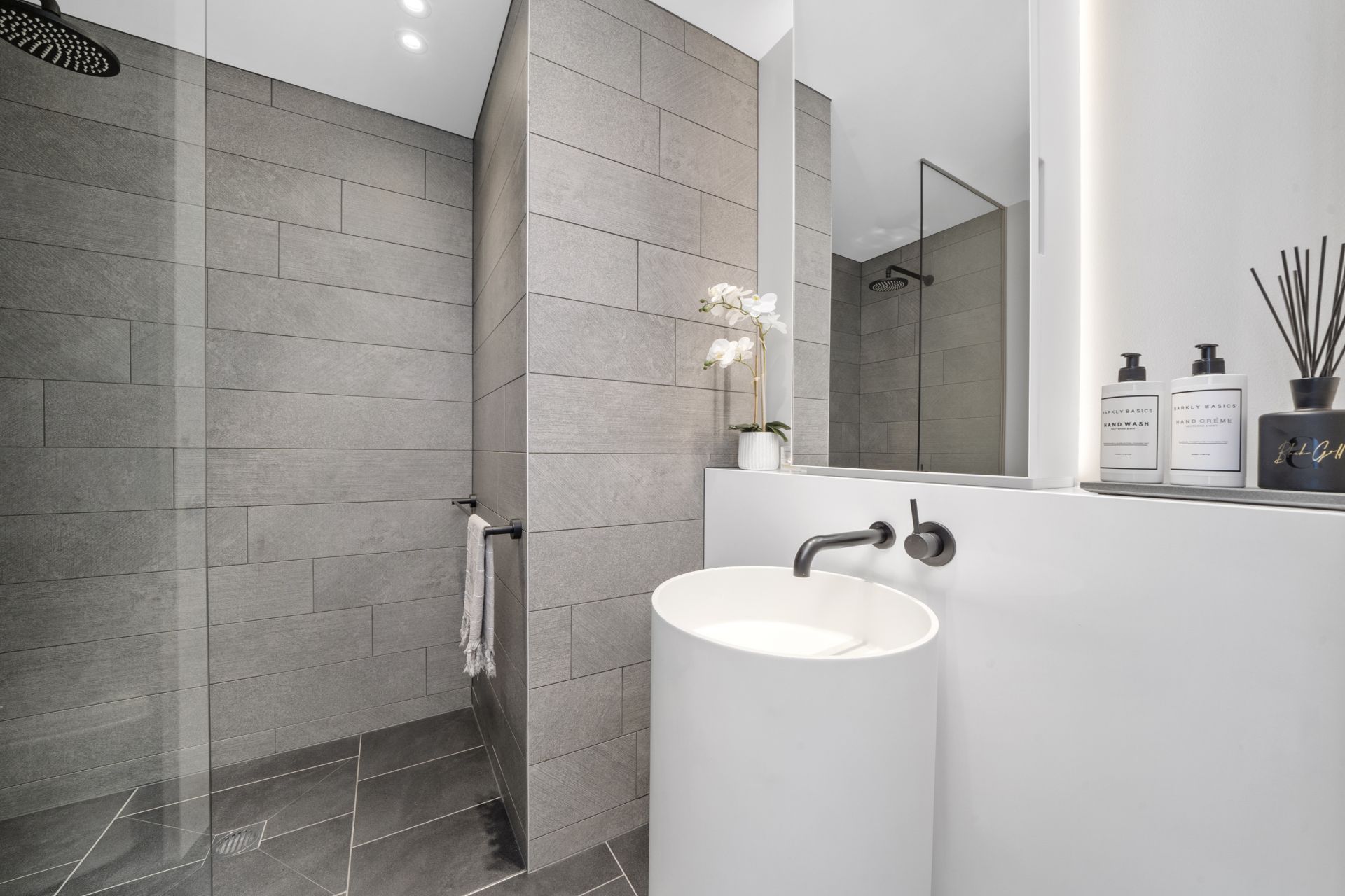 - Stylish bathroom with concealed cistern and freestanding basin