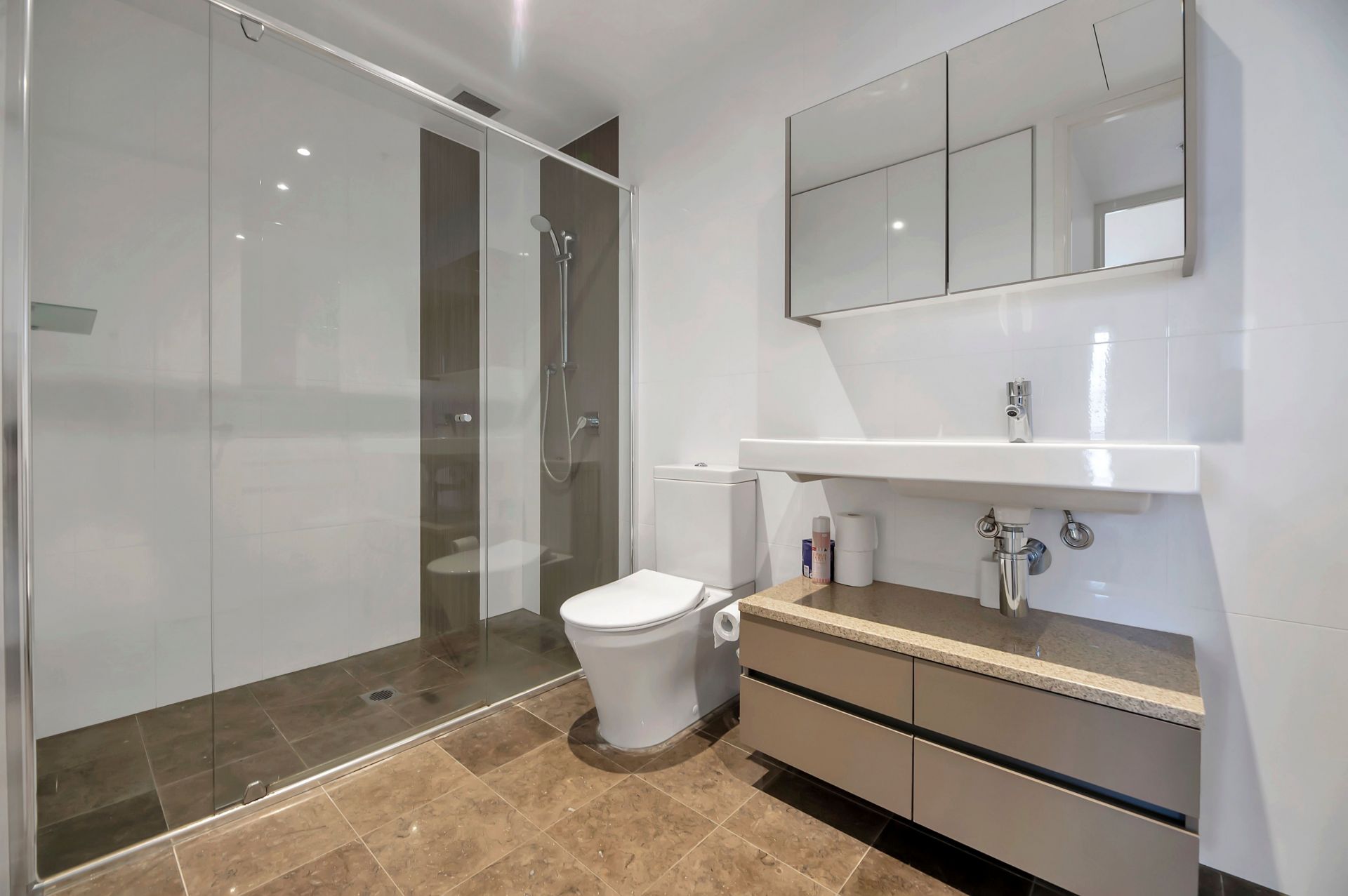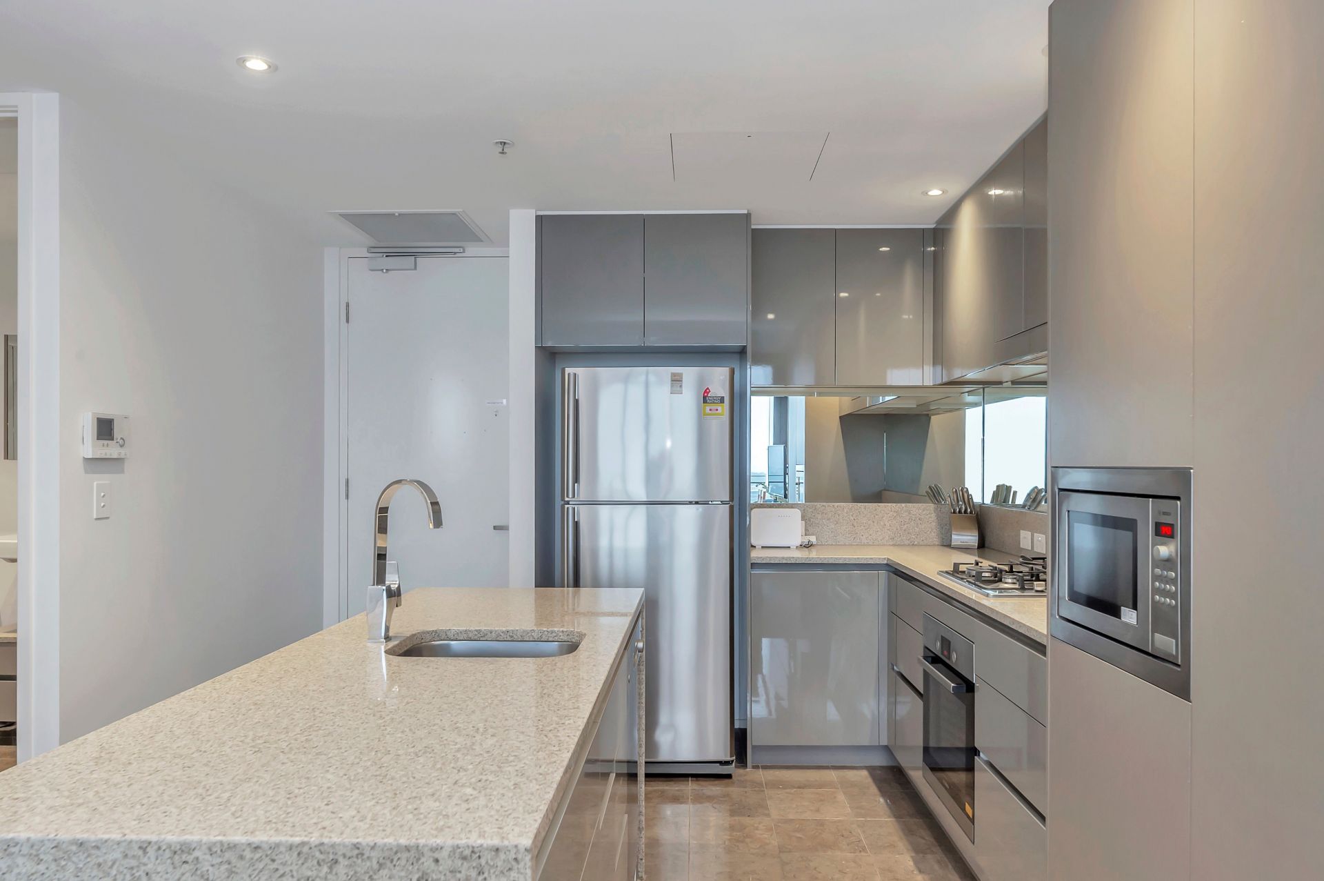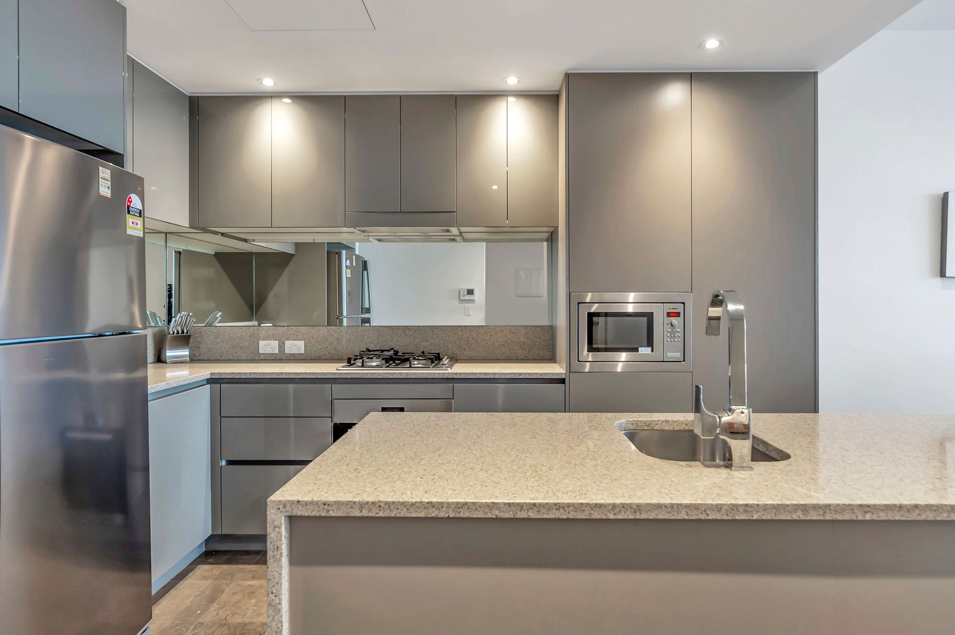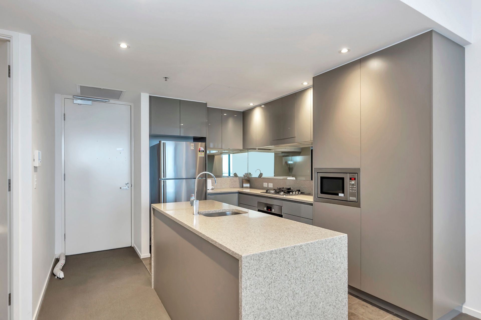 - Modern kitchen with waterfall stone bench top