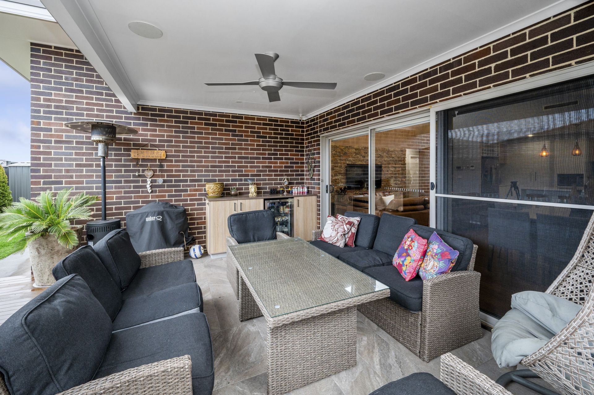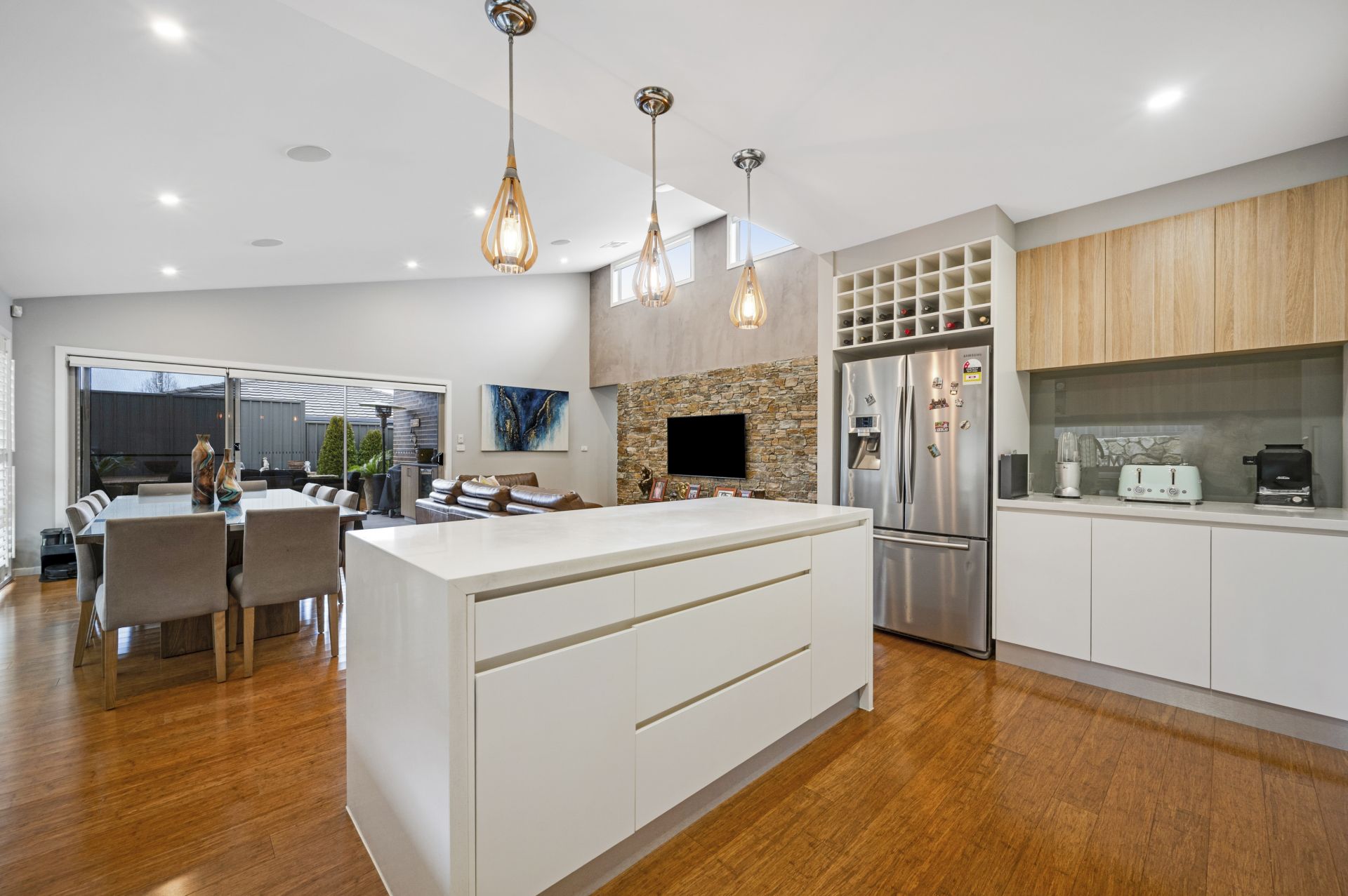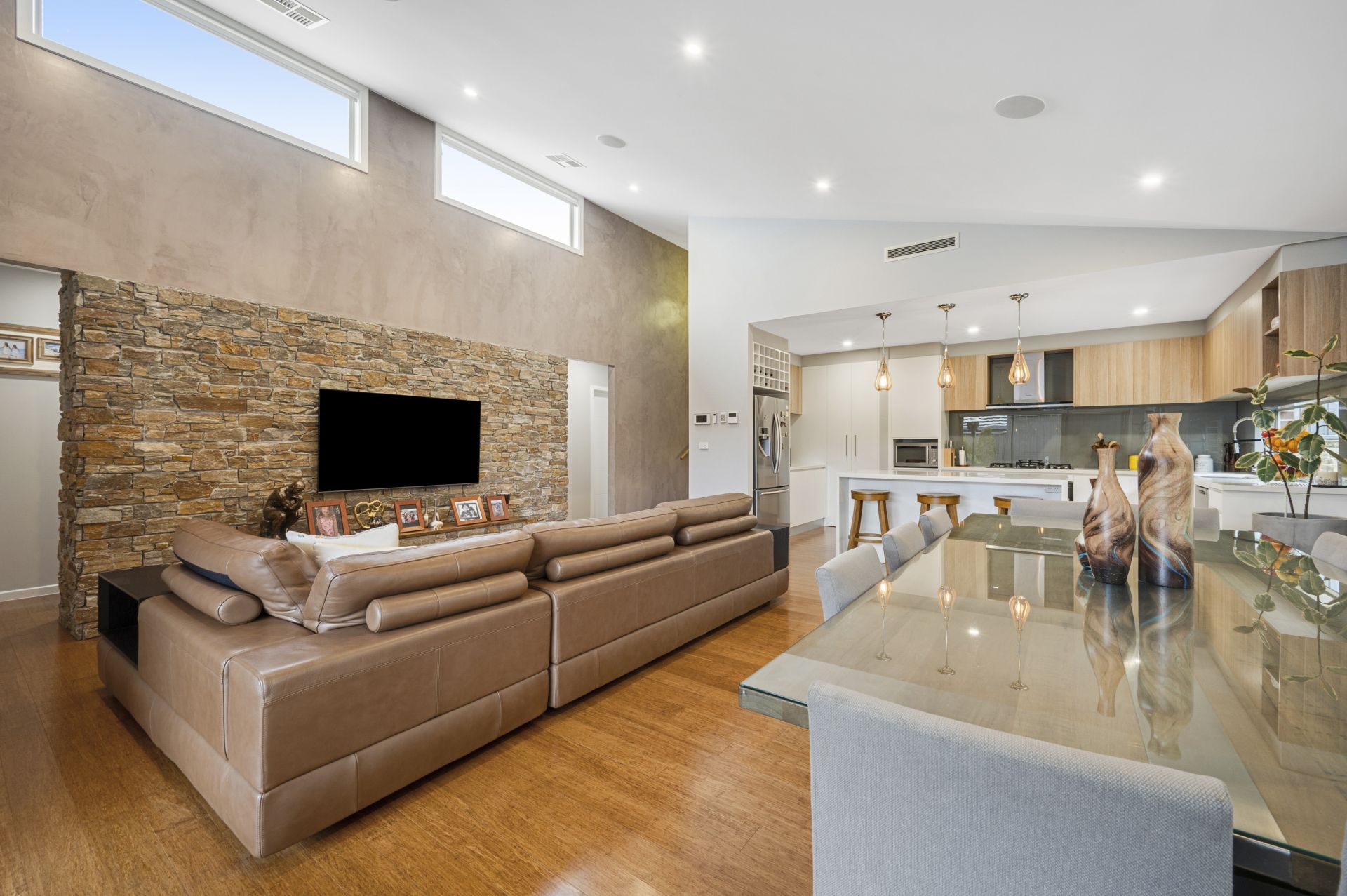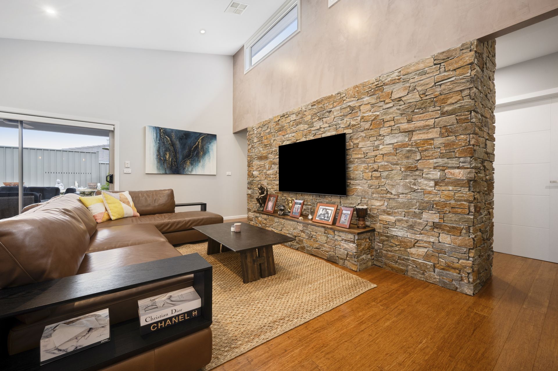 - Spacious open-plan family room with feature stackstone wall & built-in ceiling speakers