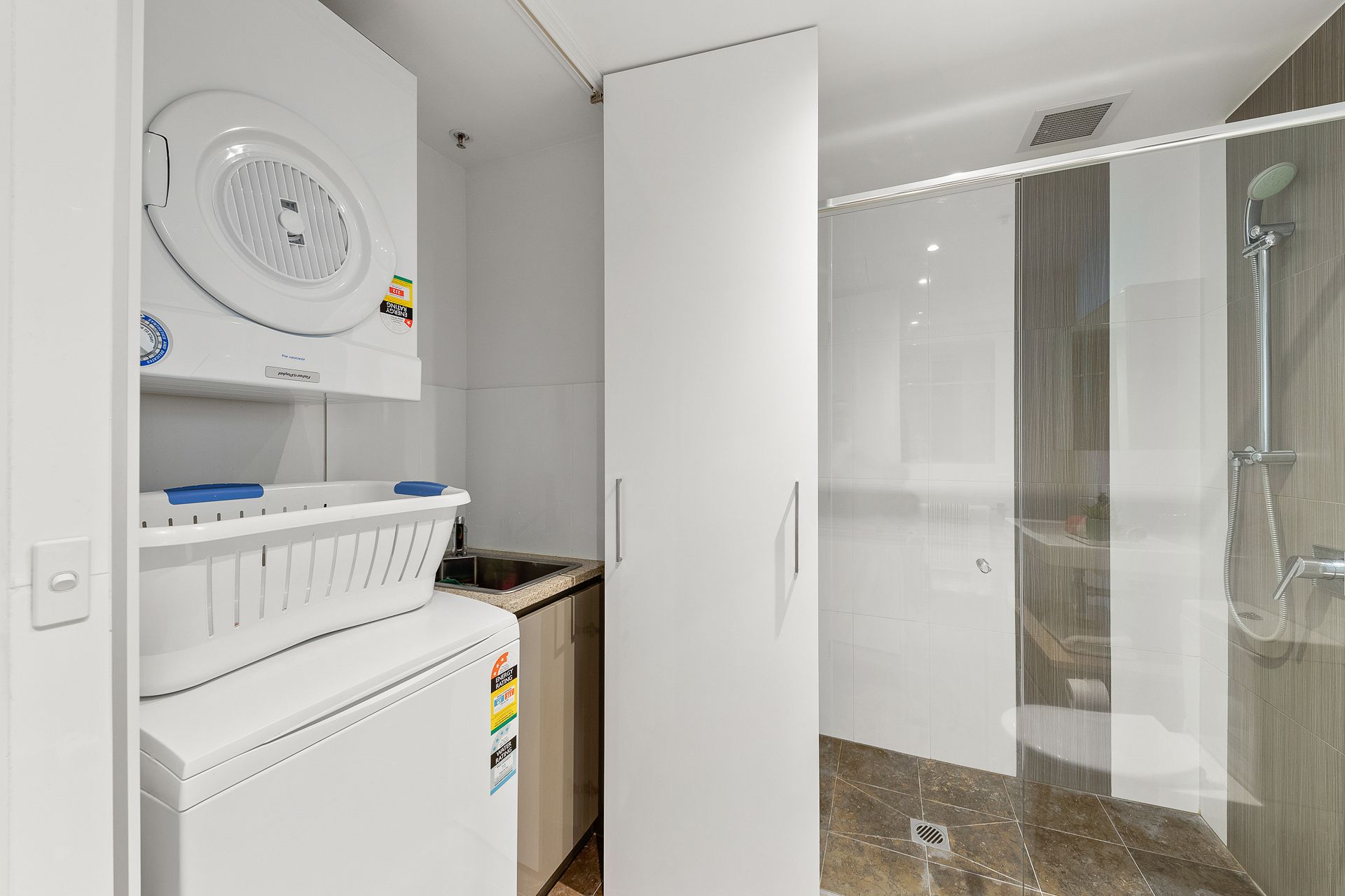 Practicality meets elegance in the enclosed laundry alcove, ensuring seamless integration of daily chores into the luxurious lifestyle this apartment affords.