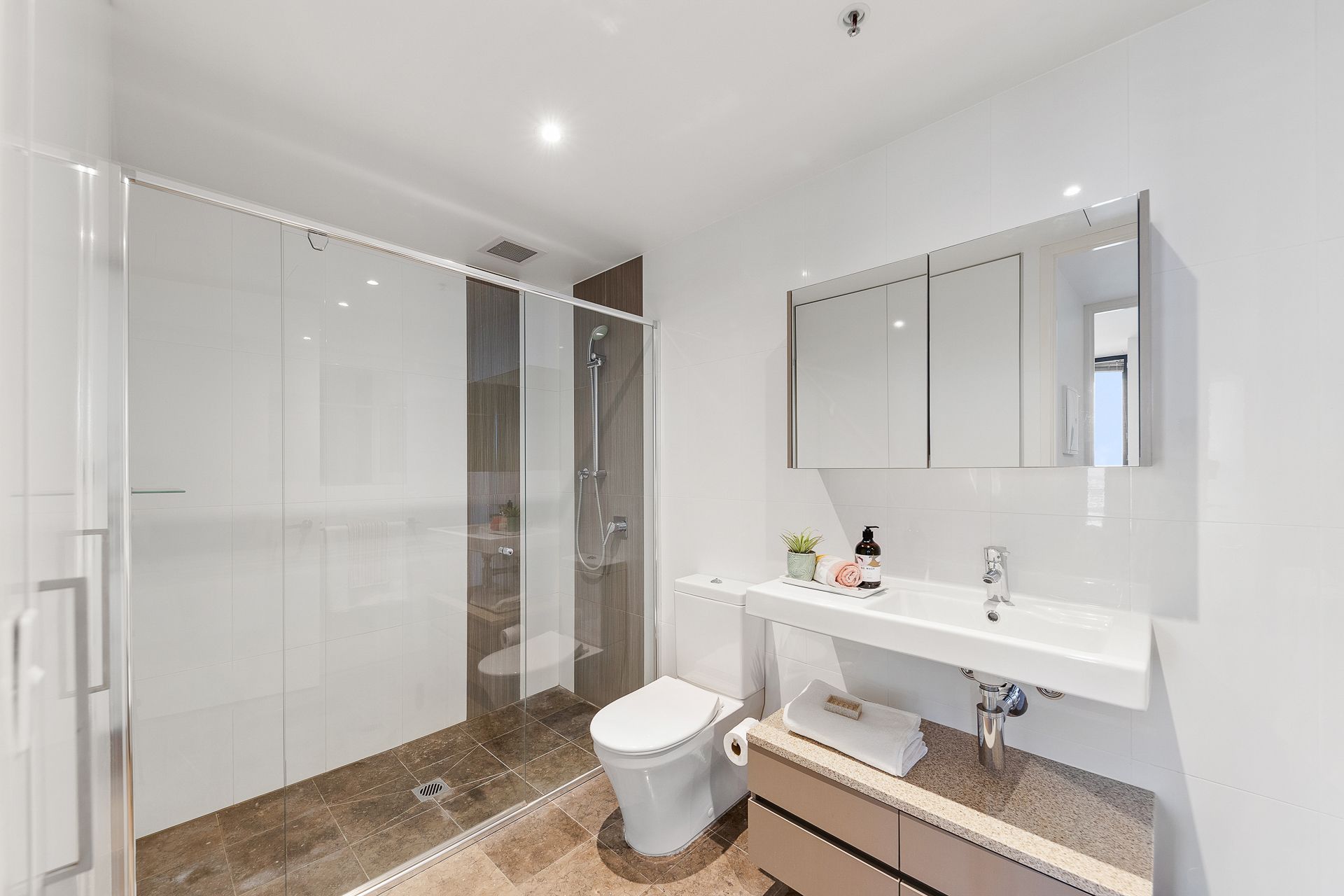 The oversized bedroom, boasts a built-in robe and large windows that bathe the space in natural light. The bathroom is a spa-like sanctuary, adorned with Grohe tapware, offering a perfect retreat after a day in the city.