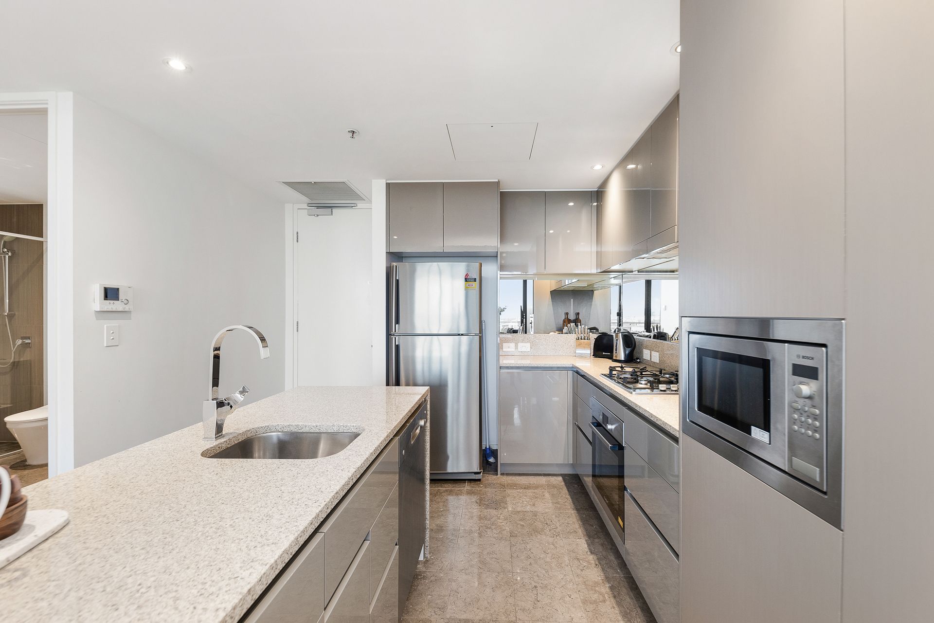 Upon entering, the high ceilings immediately set the tone for an expansive and sophisticated living space. The kitchen is a well appointed culinary haven, featuring marble benchtops, Bosch appliances, and gas cooking. The mirror splashback adds a touch of glamour, reflecting the modern aesthetic that defines the entire apartment.