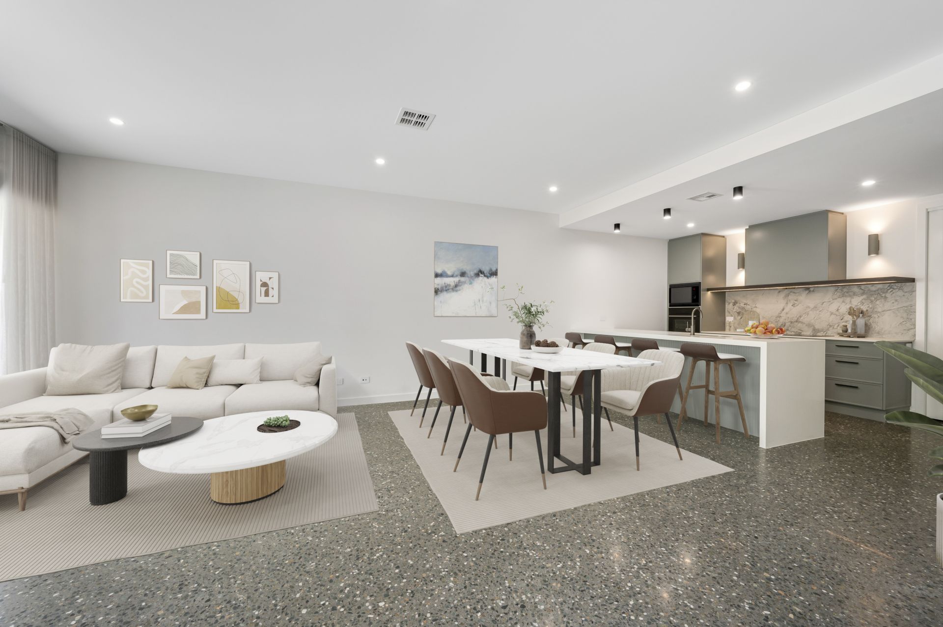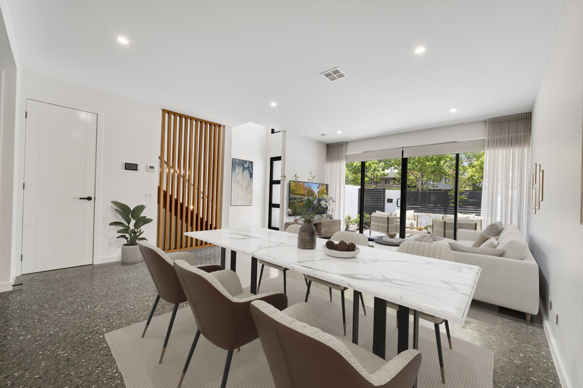 Upon entry, soaring voids create an immediate sense of space and arrival, while abundant natural light enhances the home's sophisticated palette and architectural detailing. The open-plan living and dining area flows seamlessly to a generous private courtyard, creating an ideal environment for both everyday living and entertaining.