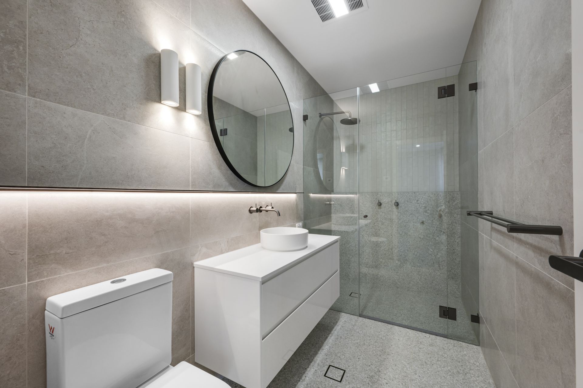Accommodation is thoughtfully arranged across three generous bedrooms, all with built-in robes. The main bedroom is complemented by a luxurious ensuite with under-tile heating, while a full upstairs bathroom services the remaining bedrooms. A powder room on the ground floor adds convenience for guests.