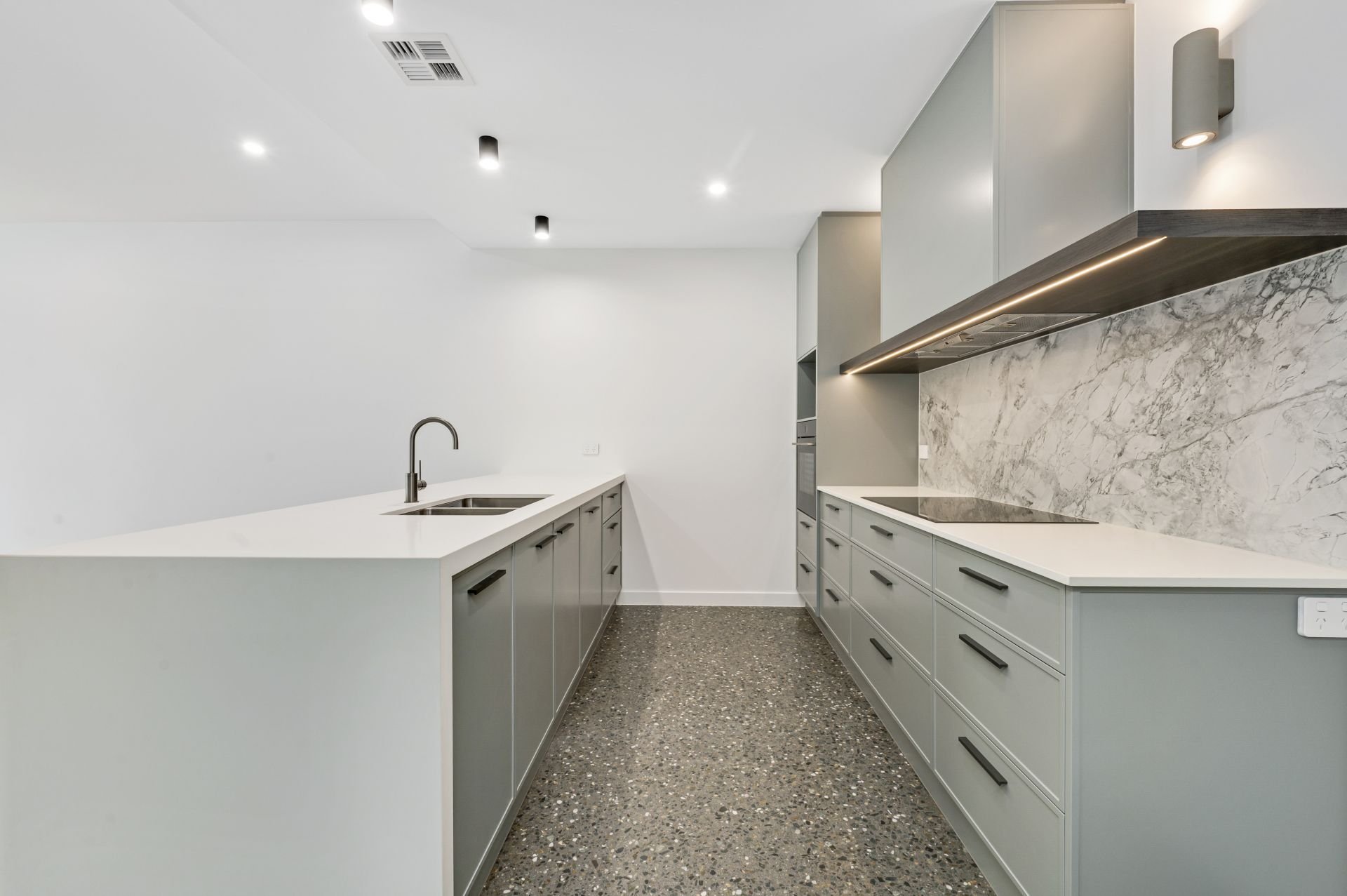 The designer kitchen is a standout, appointed with waterfall-edge stone benchtops, premium Bosch stainless steel appliances and ample preparation space-perfect for the home chef. Polished concrete flooring on the lower level adds a contemporary edge, while ducted reverse-cycle heating and cooling ensures year-round comfort.