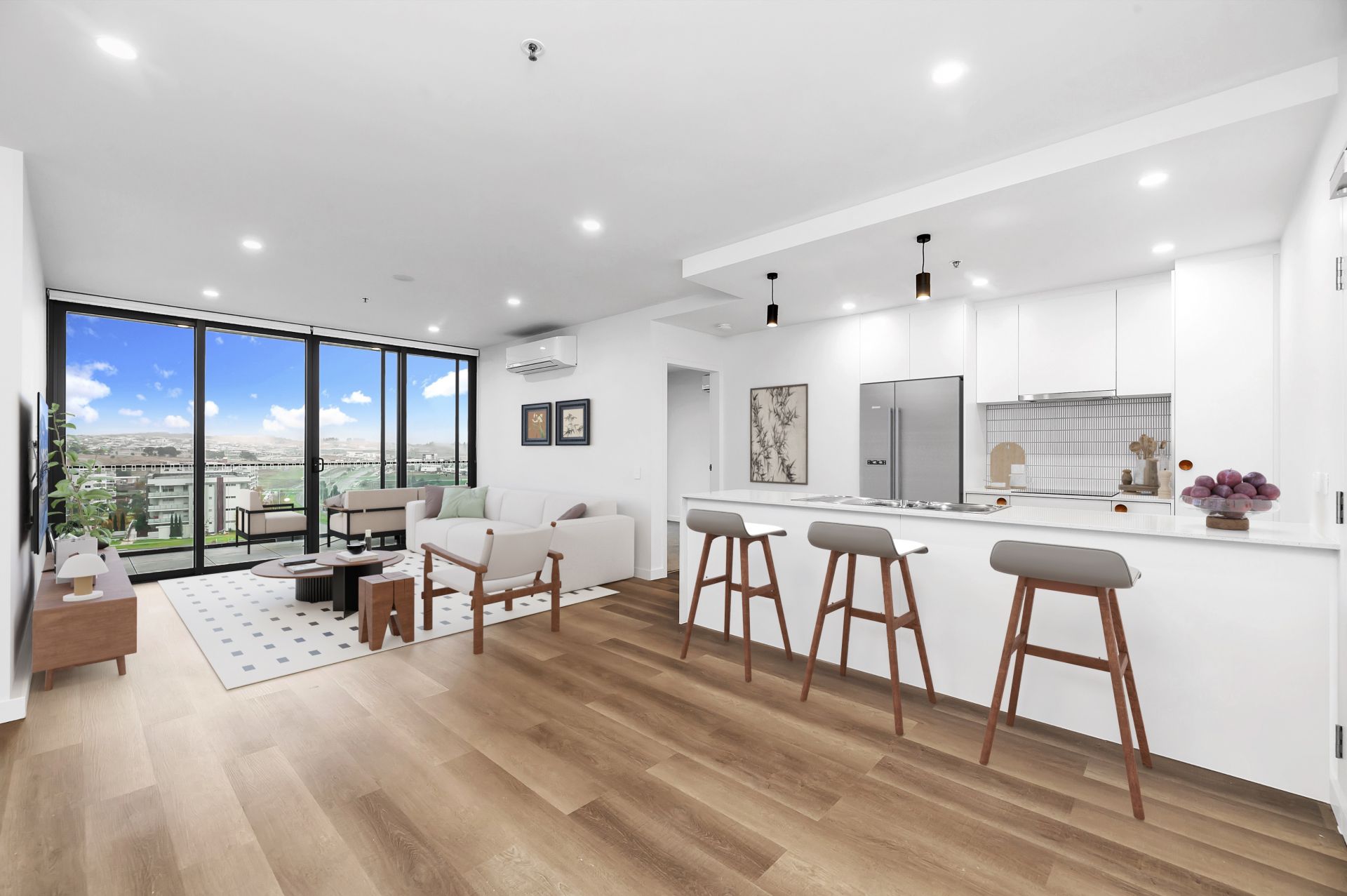 From the moment you step inside, the apartment impresses with its open-plan living, enhanced by floor-to-ceiling double glazing that floods the interior with natural light and frames a seamless connection to the expansive balcony with magnificent views. It's a home that encourages indoor-outdoor living, whether you're entertaining friends, enjoying a quiet morning coffee, or simply taking in the expansive views.