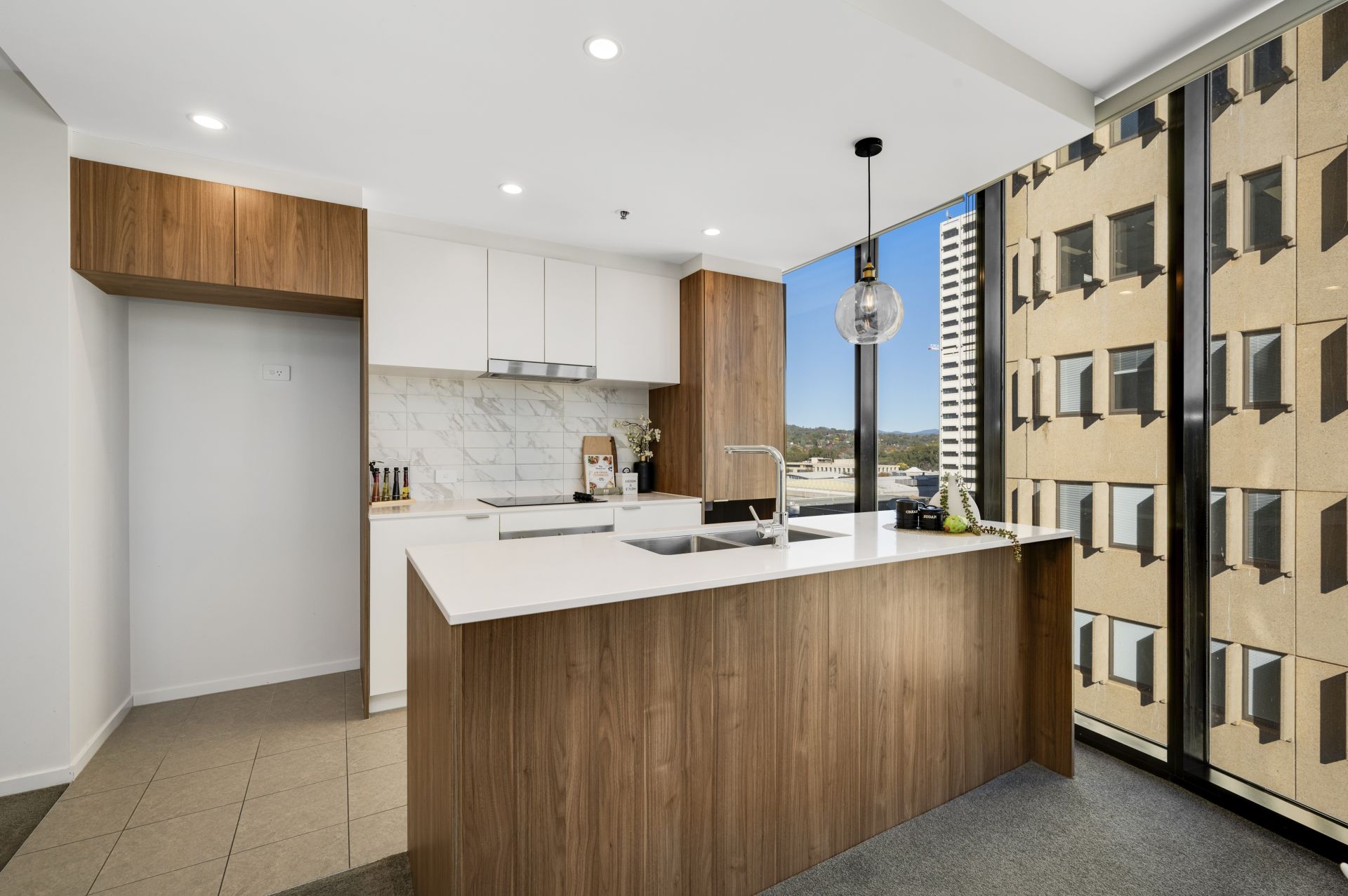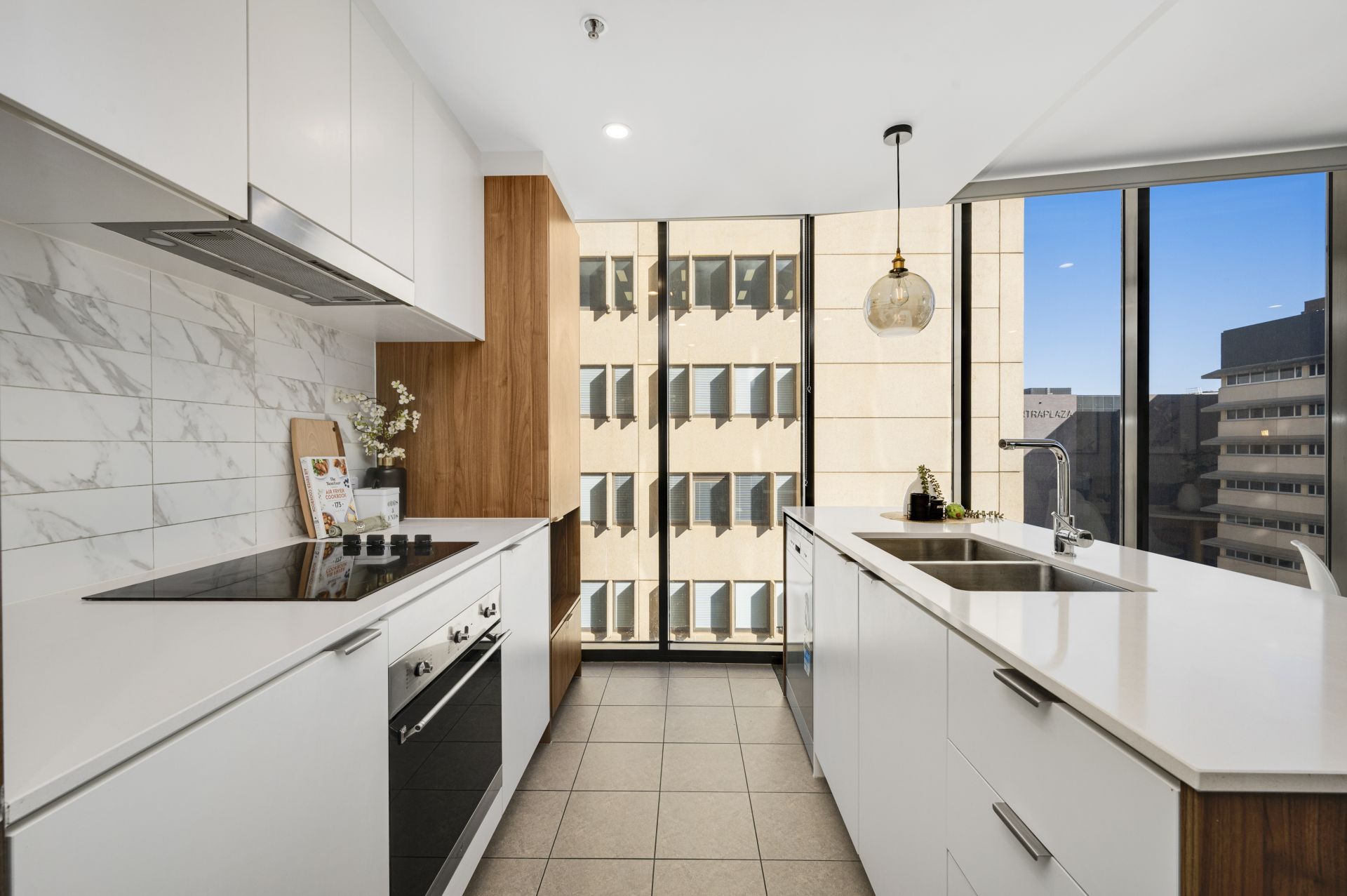 Boasting 96m² of living space plus an 8m² private balcony, this apartment is bathed in natural light and enjoys expansive northerly views. The sleek galley-style kitchen is beautifully appointed with stone benchtops, premium Smeg appliances, and a tiled splashback, making it both stylish and functional.
