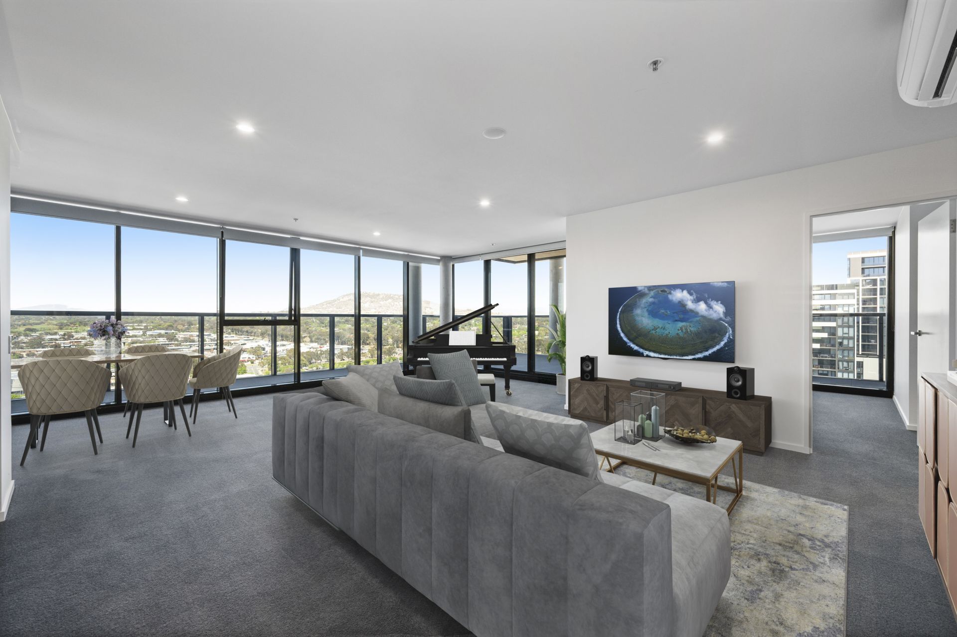- Expansive three-bedroom layout with panoramic city and mountain views